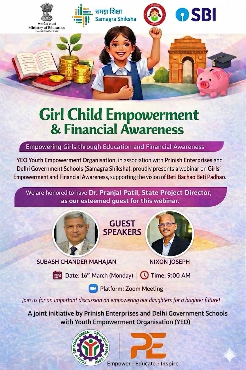YEO Youth Empowerment Organisation, in association with Prinish Enterprises and Delhi Government Schools (Samagra Shiksha), proudly presents a webinar on Girls’ Empowerment and Financial Awareness, supporting the vision of Beti Bachao Beti Padhao.